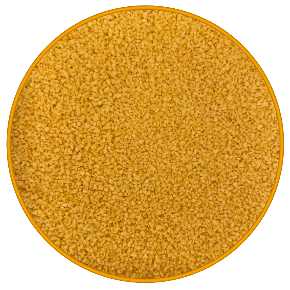 Nuestro Pan Rallado CO-32 destaca por su color amarillo asalmonado y su textura uniforme, resultado de la molienda y secado de pan elaborado exclusivamente con harina de trigo seleccionada. Ofrece un rebozado atractivo, crujiente y homogéneo, que realza el aspecto visual y el sabor de todo tipo de elaboraciones.